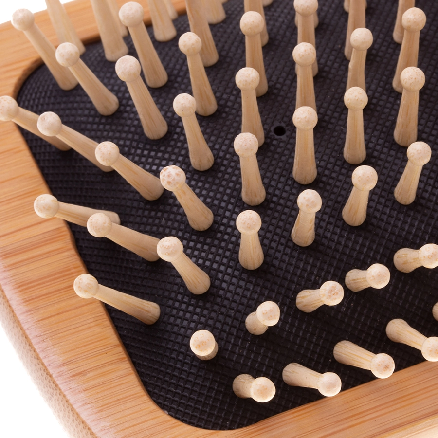 Zaobljeni leseni zatiči na prožni podlagi gladko drsijo skozi lase in masirajo lasišče brez draženja – idealno za občutljive otroške lase.
