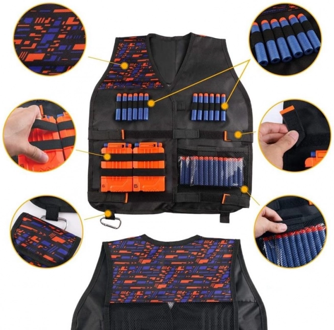 Vsebina kompleta: Komplet vsebuje taktični zaščitni telovnik, zaščitna očala, 30 puščic, rutko z vzorcem za obraz, nabojski trak za nošenje na zapestju in dodatni nabojnik za strelivo.