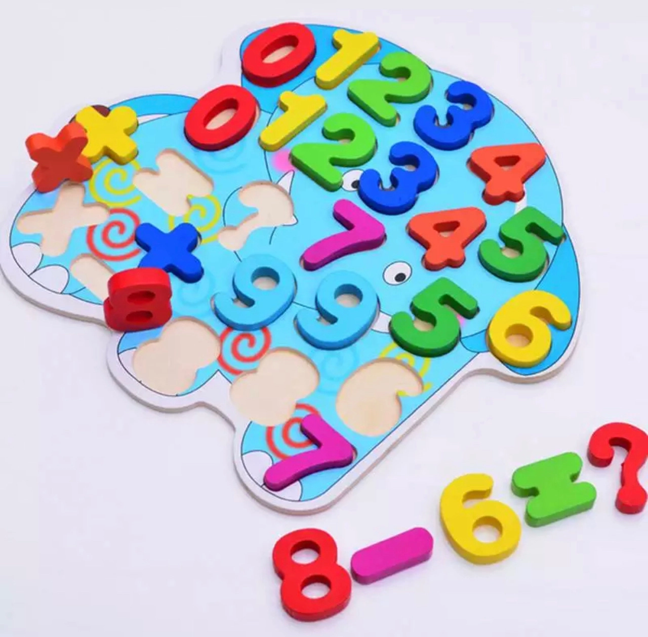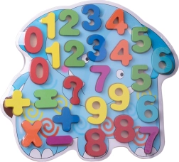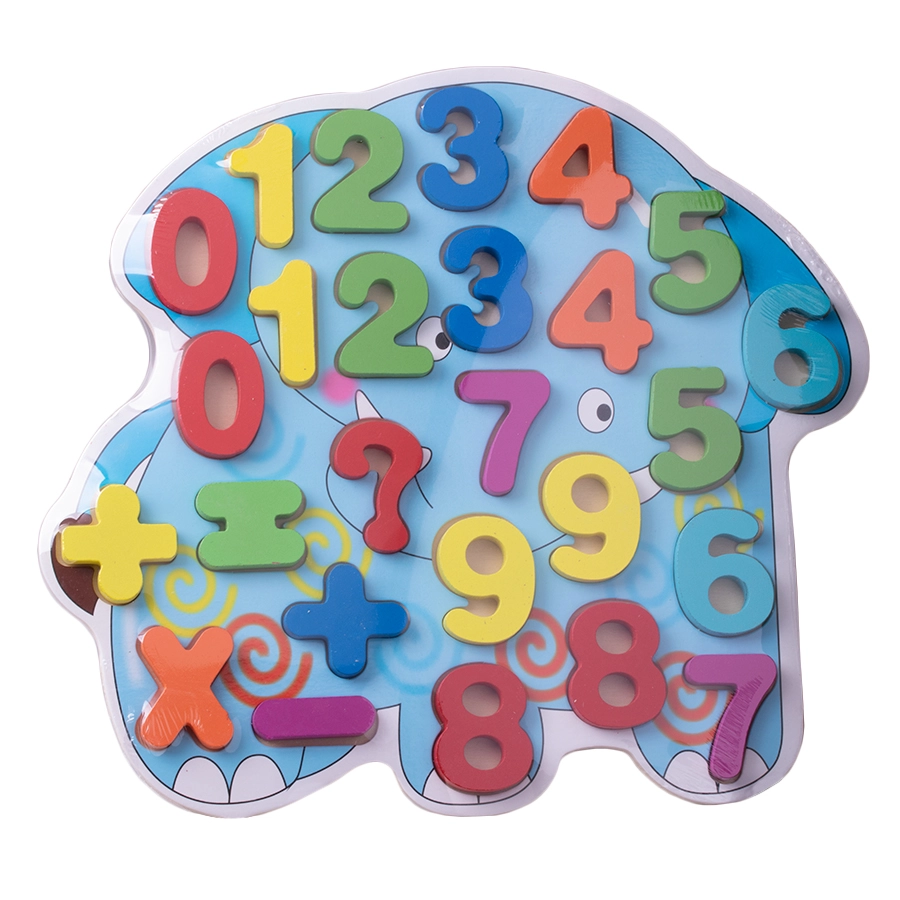 Te lesene številčne sestavljanke v obliki slona so odličen pripomoček za prvo spoznavanje s številkami in preprostimi računi. Barviti, dobro prilegajoči se koščki s številkami 0–9 in simboli +, −, × se vstavljajo v izrezane odprtine, kar krepi zbranost in natančnost.