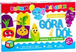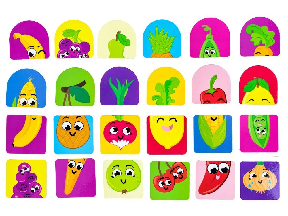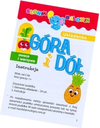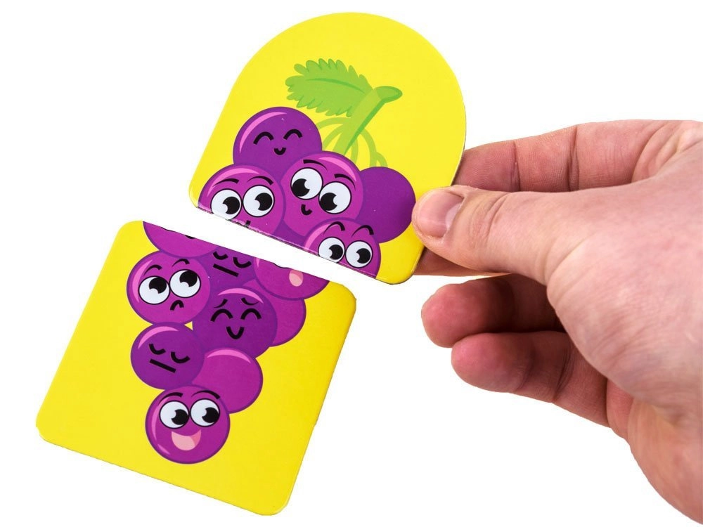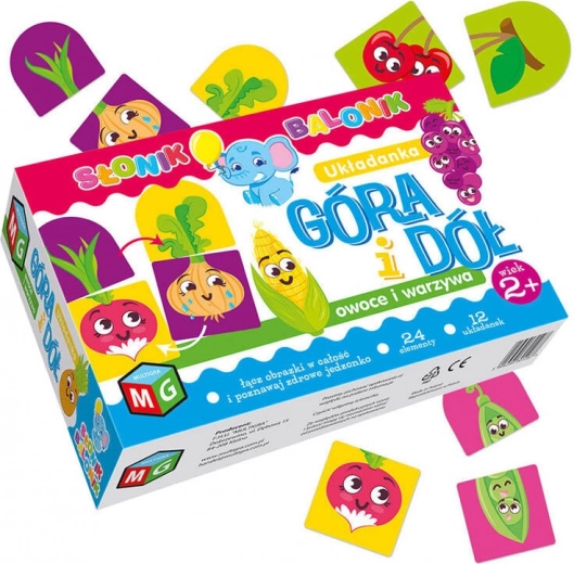 Zabavna izobraževalna igra za najmlajše, pri kateri otroci povezujejo del »zgoraj« z delom »spodaj«. S preprostimi ilustracijami z nasmejanimi motivi sadjá in zelenjave razvijajo logično razmišljanje, povezovanje v pare in opazovalne sposobnosti. Veliki koščki iz čvrstega kartona se zlahka držijo in so varni za majhne roke.