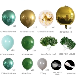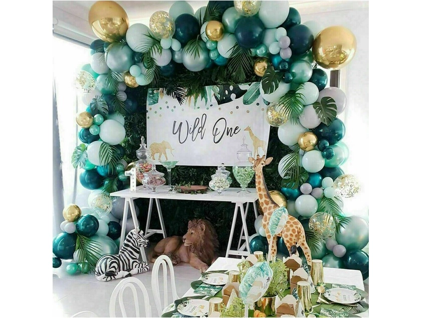 Montaža je preprosta: balone napihnite z zrakom ali helijem in jih pritrdite v trak z očesi. Manjše balone razporedite po obodu za poln in plasten učinek. Tropski in palmovi listi dodajo rezultatu eksotičen pridih in odlično dopolnjujejo zeleno-zlato paleto.