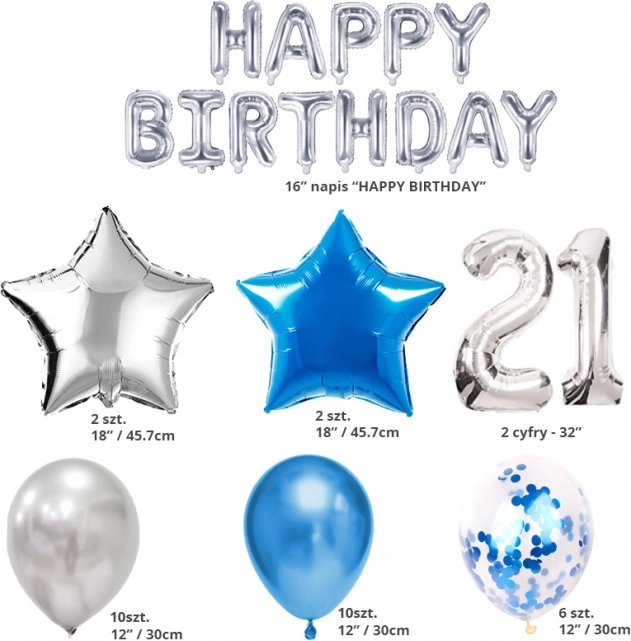 Set rojstnodnevnih balonov vam omogoča ustvariti edinstveno vzdušje na praznovanju 21. rojstnega dne. Nepozabna izkušnja za slavljenko ali slavljenca in vse udeležence zahvaljujoč izvirni dekoraciji.