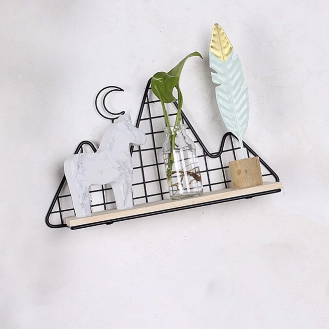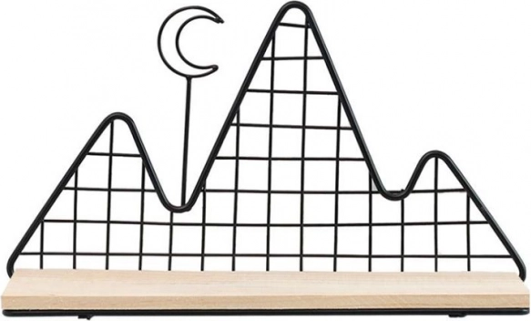 Ta dekorativna polica v elegantni črni barvi združuje funkcionalnost in dizajn. Lahka žičnata konstrukcija z gorskim motivom deluje zračno, medtem ko trdna lesena polica varno nosi drobne dekoracije, sveče, rastline, okvirje ali najljubše knjižice.