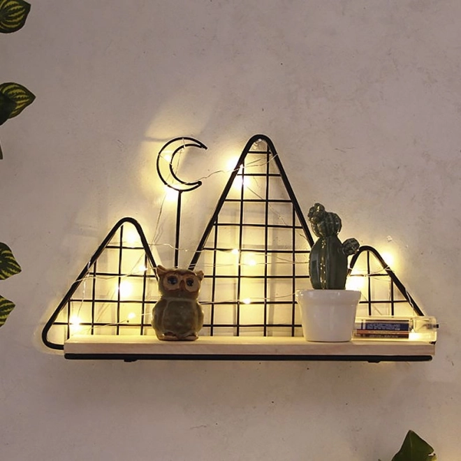 - Moderen videz: črni kovinski okvir z geometrijskim/gorskim motivom in naravna lesena polica.