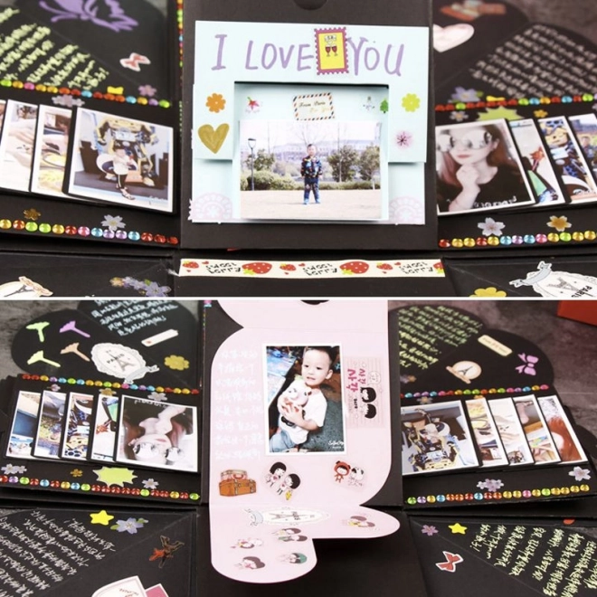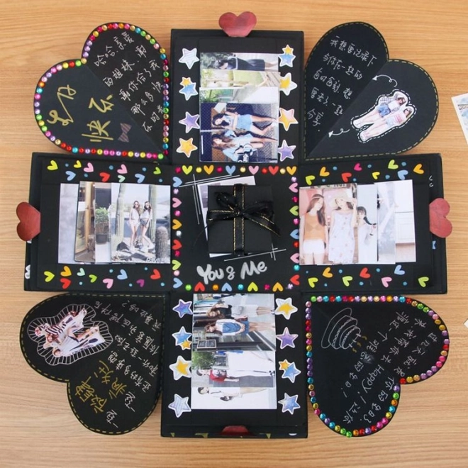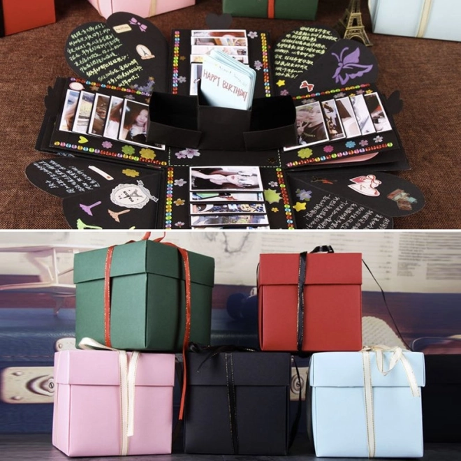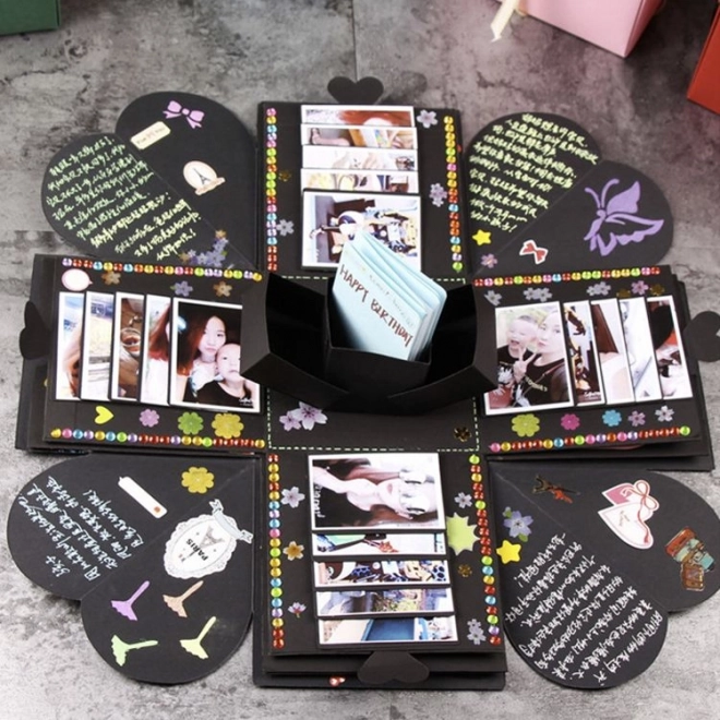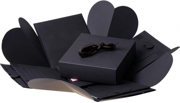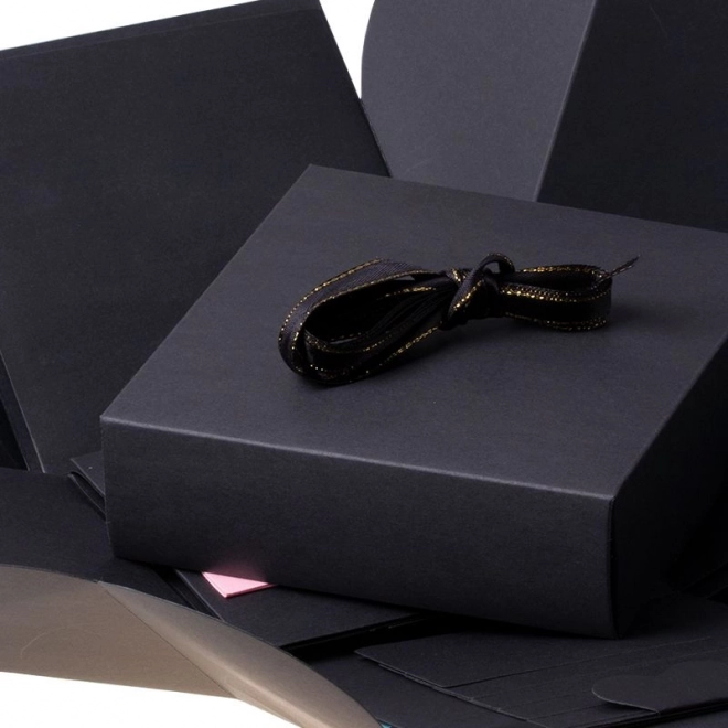 Presenetite svoje bližnje z edinstvenim darilom v obliki črne eksplozijske darilne škatlice. Ta škatlica je popolno presenečenje za poroko, valentinovo, zaroko, rojstni dan ali katero koli drugo slovesno priložnost. V najmanjšo škatlico lahko položite nakit, uro ali drugo drobno darilce. Okrāšite notranjost s fotografijami, pozdravi ali s čimerkoli, kar vam pride na misel, in iz tega darila naredite nekaj nepozabnega.