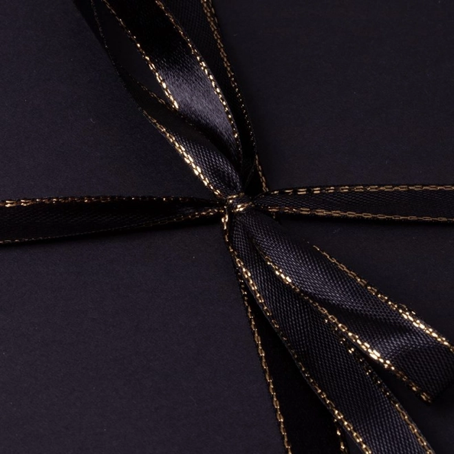 Črna darilna škatlica z bleščečim črnim trakom in elegantnim videzom je primerna za vse slovesne priložnosti.
