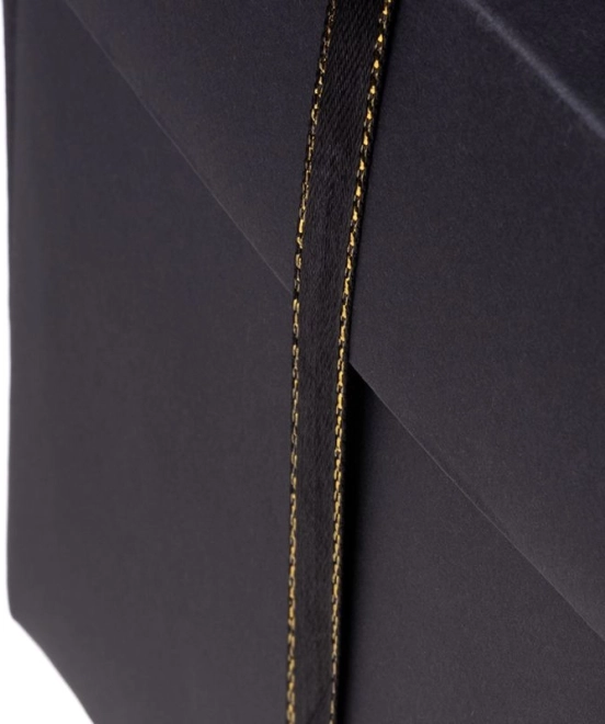 Škatlica s črnim trakom in zlatim prešitjem, primerna za elegantno darilno predstavitev.