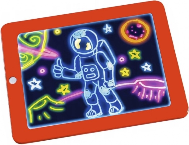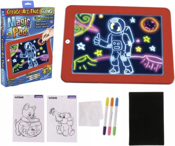 Magična 3D risalna tablica s flomastri je odlično orodje, ki ne le zagotavlja veliko zabave za vašega otroka, temveč jo lahko uporabite tudi kot izobraževalni pripomoček. Z risanjem na to tablico otrok razvija domišljijo in ročne spretnosti. Tablica je primerna tako za zabavo doma kot na potovanjih, pri obiskih družine ali v čakalnici pri zdravniku. Praktična velikost omogoča enostavno prenašanje v torbici ali nahrbtniku. LED osvetlitev naredi risbe privlačne, zlasti v polmraku.