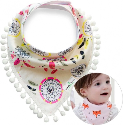 Prisrčen otroški šal z bunčkami je odličen dodatek za vrat, ki dobro služi tudi kot slinček v obdobju izraščanja zob. Udobno zapenjanje s pritiskači ne tišči otroka, na voljo pa je tudi nastavljiv rob.