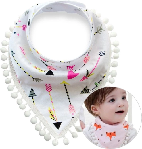 Prisrčna otroška ruta s cofki je odličen modni dodatek za okoli vratu, ki dobro deluje tudi kot slinček za malčke ob izraščanju zob. Udobno zapenjanje s pritiskači otroka ne tišči, na voljo pa je tudi nastavljiv rob.