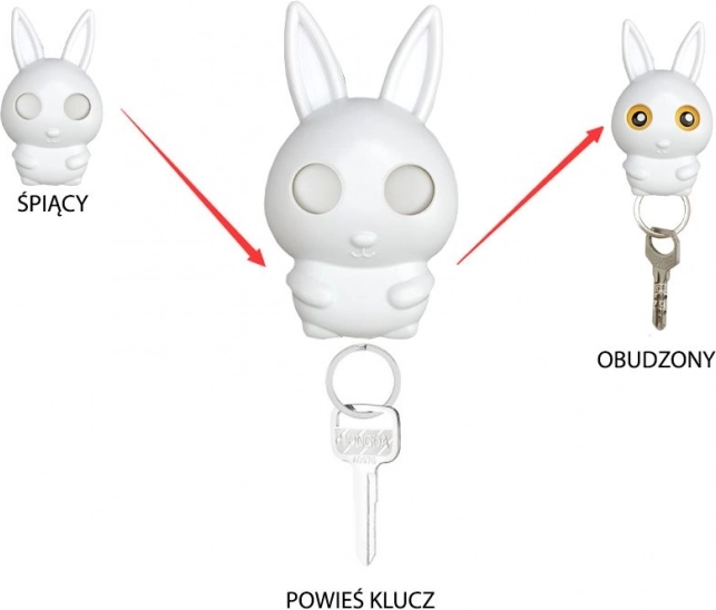 Stenski obešalnik za ključe, idealen za predsobo, kamor po prihodu domov odložite ključe. Ko ključe obesite, vam zajčkove oči „oživijo“, da lahko vedno pazite nanje. Z namestitvijo obešalnika tik ob izhodu na ključe nikoli več ne boste pozabili – odprte zajčkove oči vas bodo zagotovo spomnile.