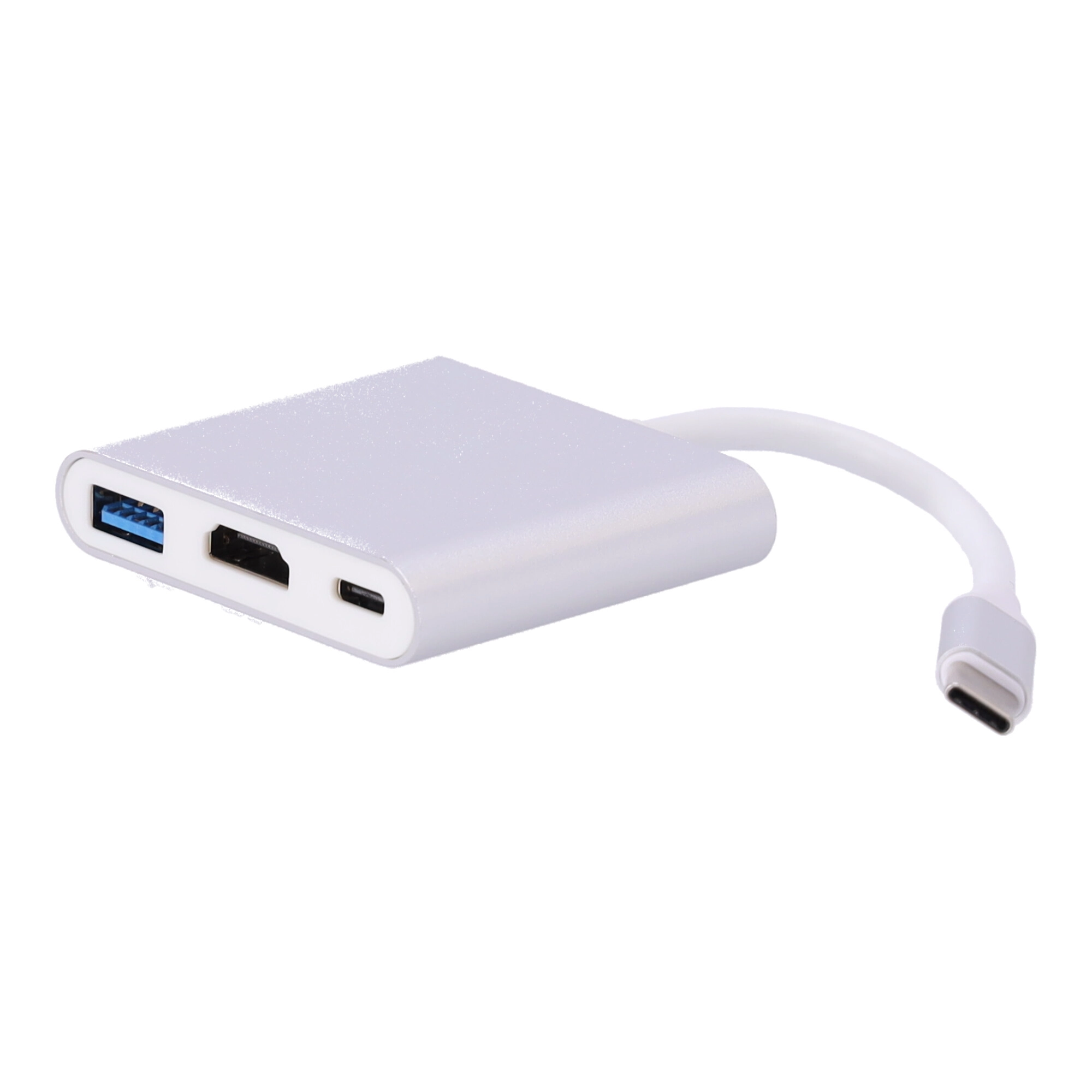Kompakten aluminijasti USB‑C hub 3-v-1 razširi vaš prenosnik ali tablico z HDMI izhodom, USB‑A 3.0 priključkom in USB‑C za napajanje. Ponuja 4K HDMI, hiter prenos podatkov, sočasno polnjenje in Plug & Play brez nameščanja gonilnikov.