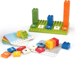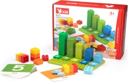 Ta set združuje zabavo in učenje: s številskimi kockami in aktivnostmi na karticah se otroci učijo šteti, primerjati količine in sestavljati preproste enačbe. Barviti kosi spodbujajo samostojno igro ter naravno podpirajo domišljijo in prostorsko zaznavanje.