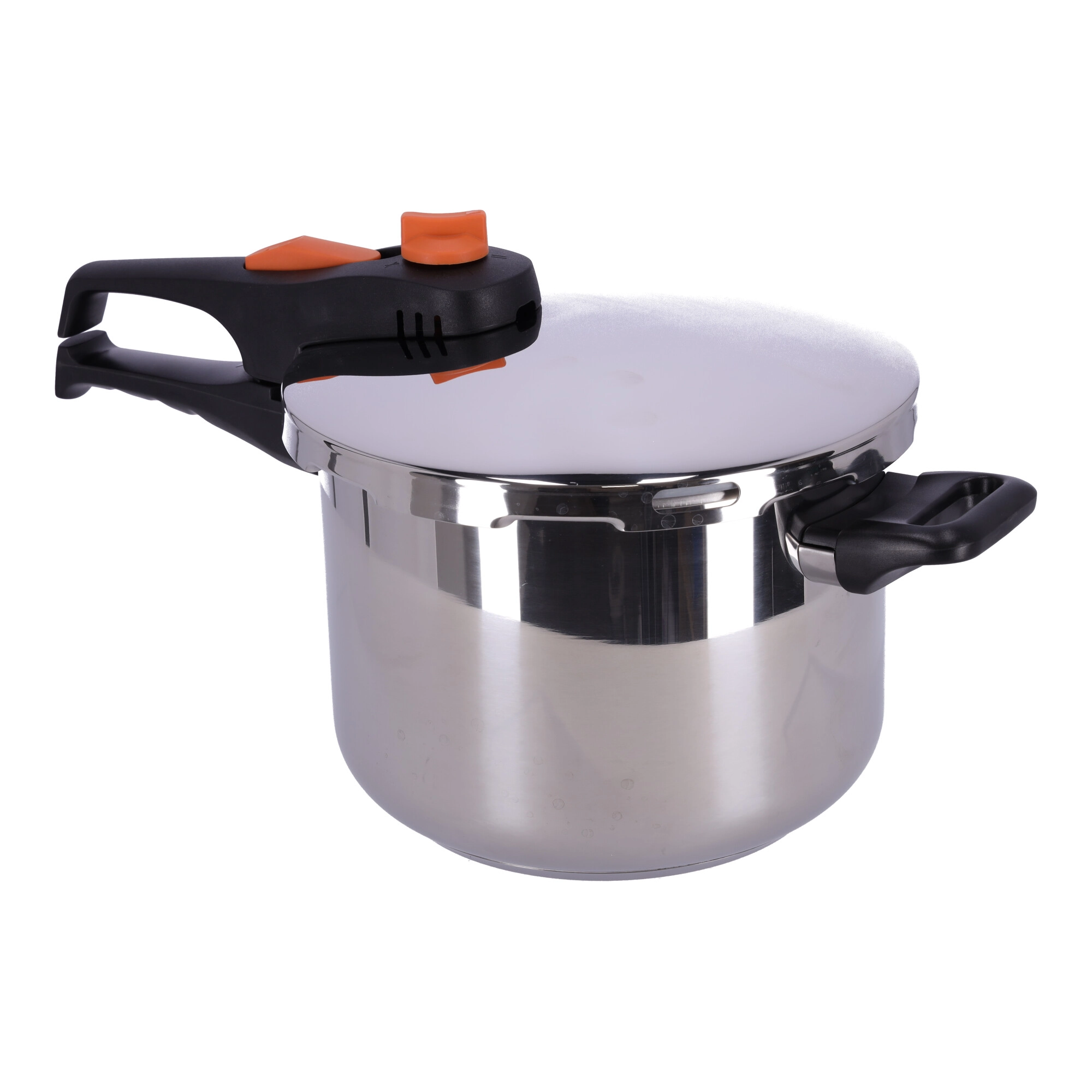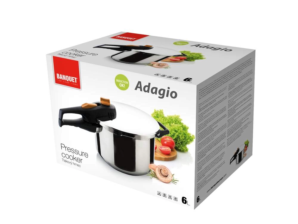 Tlačni lonec BANQUET ADAGIO s prostornino 6 litrov pospeši pripravo priljubljenih jedi, ohrani več vitaminov in mineralov ter hkrati prihrani čas in energijo. Robustno nerjavno jeklo 18/8, 1 mm debela stena in 5 mm debelo sendvič dno zagotavljajo stabilno segrevanje in dolgo življenjsko dobo. Varno bajonetno zapiranje, delovna odprtina in varovalo proti odpiranju pod tlakom omogočajo mirno in udobno uporabo.