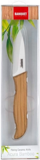 Praktičen keramični nož ACURA BAMBOO 18 cm, keramično rezilo (cirkonijev oksid) dolžine 7,5 cm, debelina rezila 1,6 mm, bambusov ročaj. Rezilo keramičnega noža je izdelano iz keramičnega materiala, imenovanega cirkonijev oksid. Ta zmes se odlikuje po visoki trdoti in trdnosti. Ergonomski ročaj je iz TPR z nedrsečo površino. Nož je zelo odporen proti madežem in se enostavno čisti. Rezilo ne prepušča kislin, ki jih vsebuje hrana. Vitamini se zaradi keramičnega rezila iz živil ne izgubljajo. Meso, zelenjava in sadje se na nož ne lepijo. Nož ima zelo majhno težo in uravnoteženo težišče, zato je pri delu z njim enostavno rokovati. Keramični noži so trši od kovinskih, zato ne potrebujejo vsakodnevnega brušenja kot jekleni noži. Kompromis za njihovo visoko trdoto je njihova krhkost, zato se ne priporoča rezanje npr. kosti, zvijanje noža pri rezanju ali dopuščanje padca noža na tla.