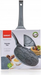 Ponev BANQUET Granite Gray Smile bo navdušila otroke in odrasle. Sedem okroglih vdolbin (8 cm) zagotavlja enakomerno pečene palačinke, blinčke ali jajca na oko, in to zahvaljujoč masivnemu 4-mm korpusu z odlično akumulacijo toplote. Neprijemljiv dvoplastni premaz Dyflon zmanjšuje prijemanje in olajša kuhanje z manjšo količino olja.