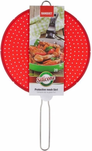 Predstavljamo silikonsko zaščitno sito za ponev CULINARIA, ki je idealno za vsako kuhinjo. Njegova perforirana zasnova učinkovito preprečuje škropljenje olja, hkrati pa omogoča izhajanje pare, kar zagotavlja čistočo in varnost pri kuhanju. Sito je opremljeno s kovinskim ročajem za enostavno uporabo.