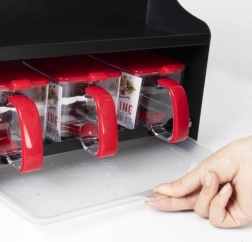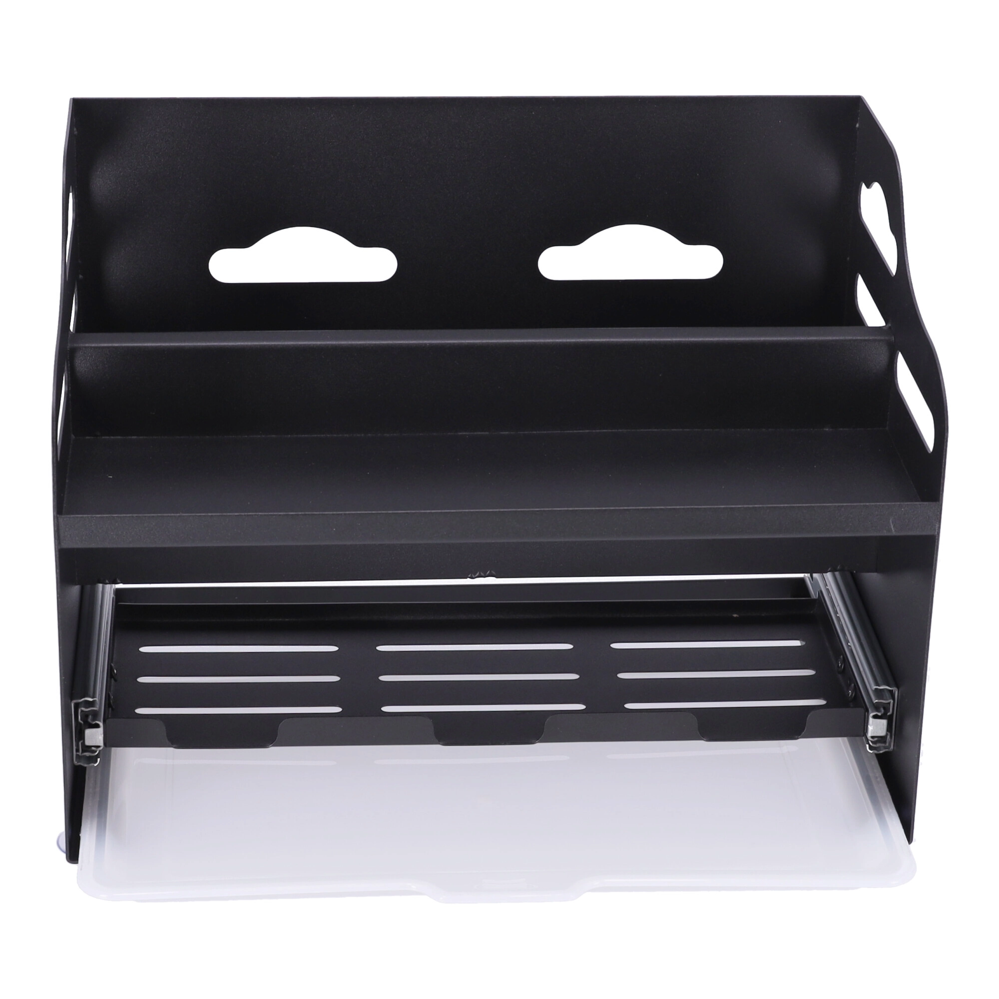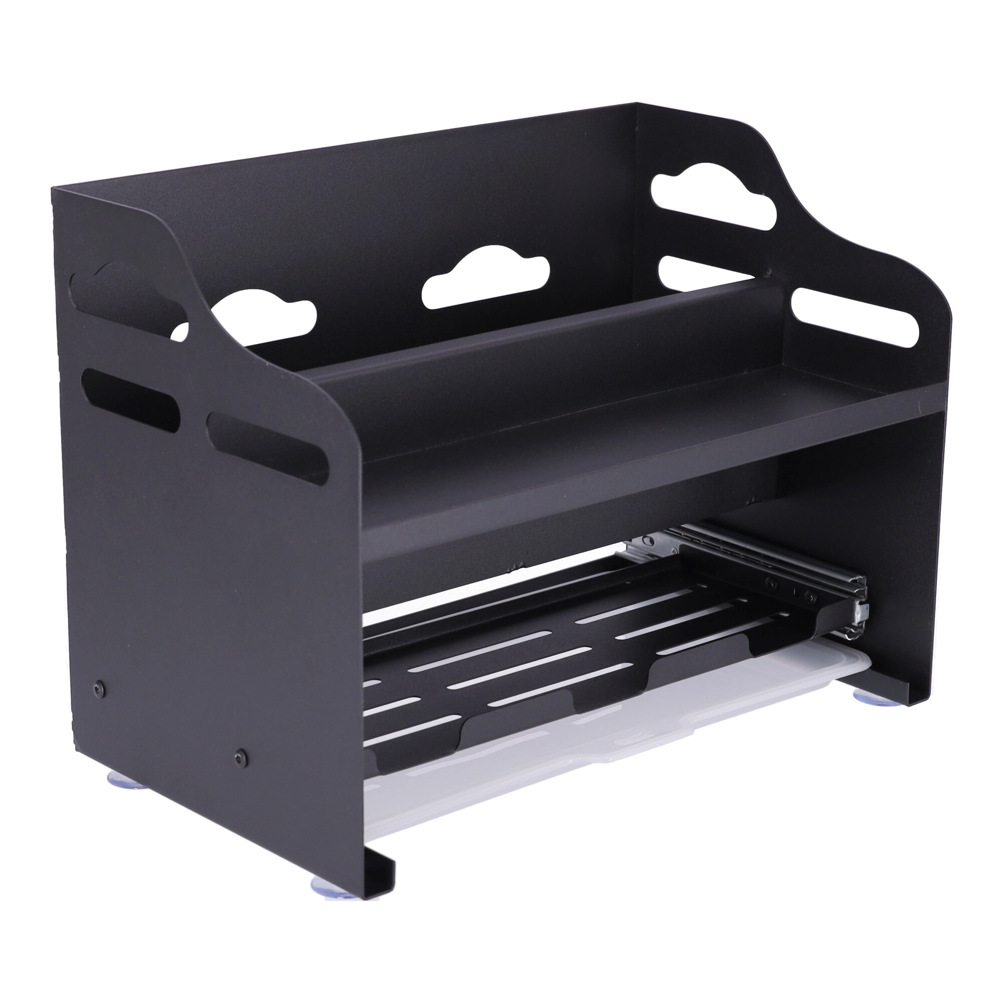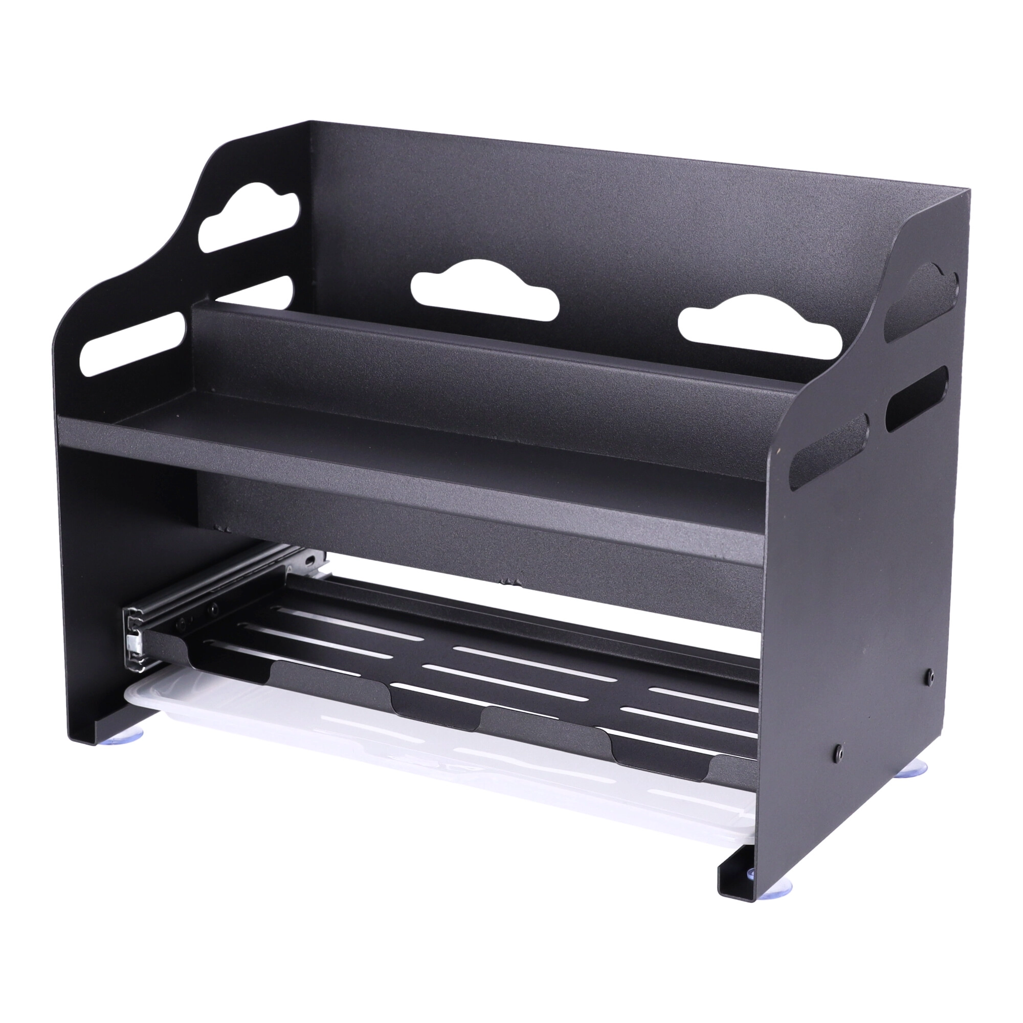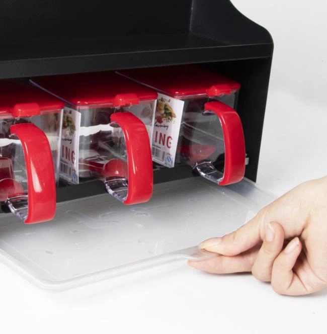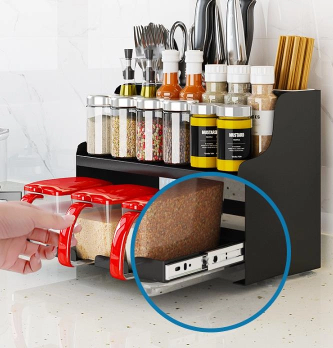 Dvonivojska zasnova omogoča udobno shranjevanje začimbnic, pločevink, steklenic z oljem in visokih lončkov zgoraj, medtem ko spodaj ostaja prostor za sladkor, moko ali kavo. Sprednji vložni posodici in zgornje reže so idealne za kuhalnice, klešče, metlice in druge kuhinjske pripomočke.