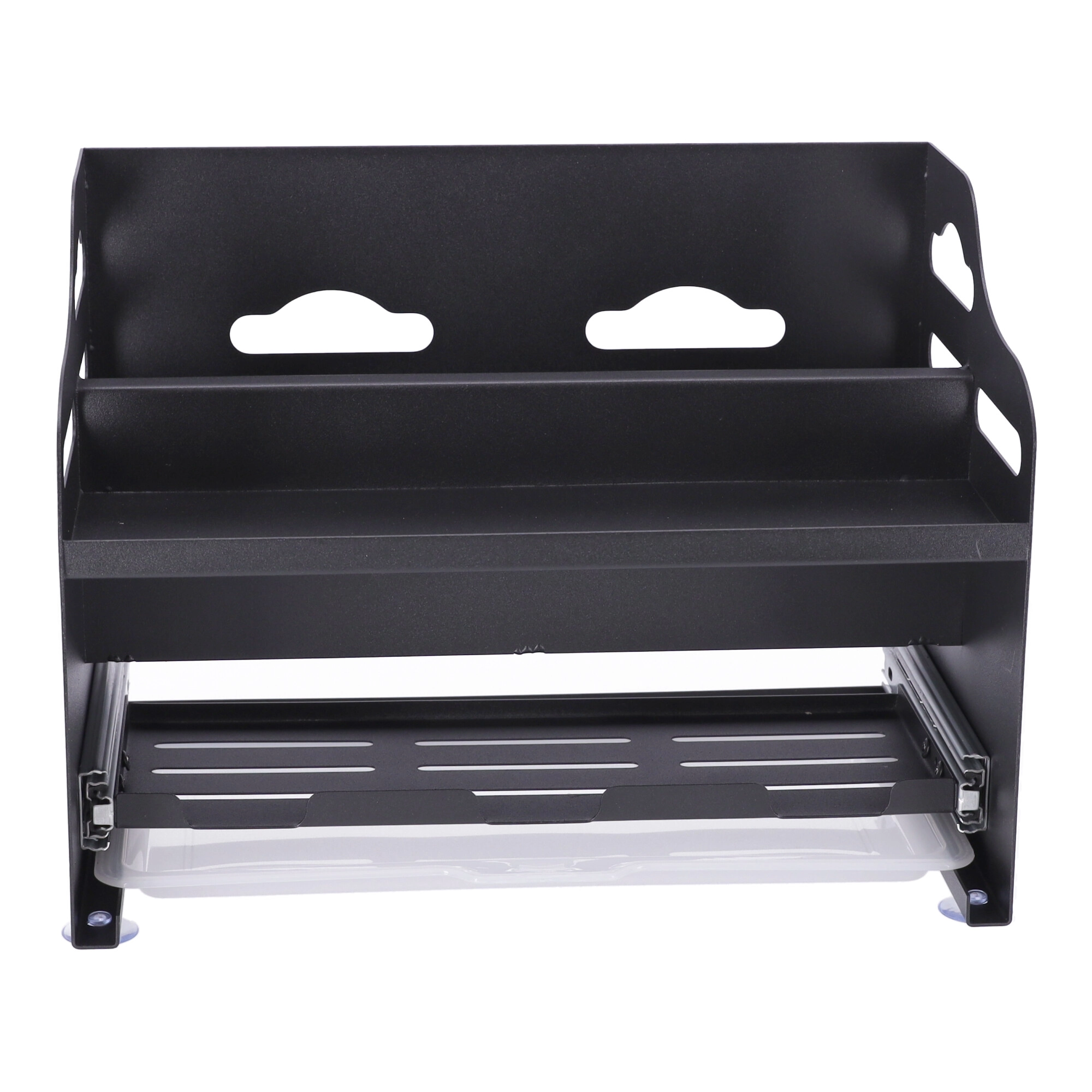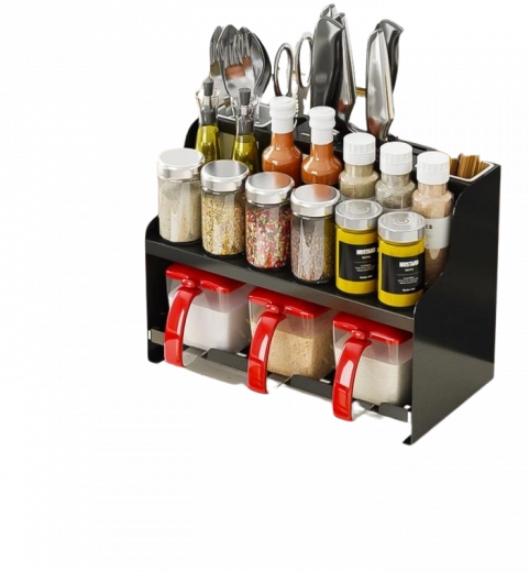 Večnamenski dvonadstropni organizator za začimbe s predelki za kuhinjske pripomočke – črn