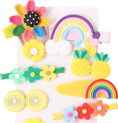 Ljubek set 14 barvnih lasnih sponk za deklice združuje stil in praktičnost. Različne oblike in motivi – od cvetlic do mavric in sadja – zanesljivo držijo pričesko na mestu in vsakodnevnim ter slavnostnim opravám dodajo igriv šarm. Odlično za vrtec, šolo ter poroke ali krste.