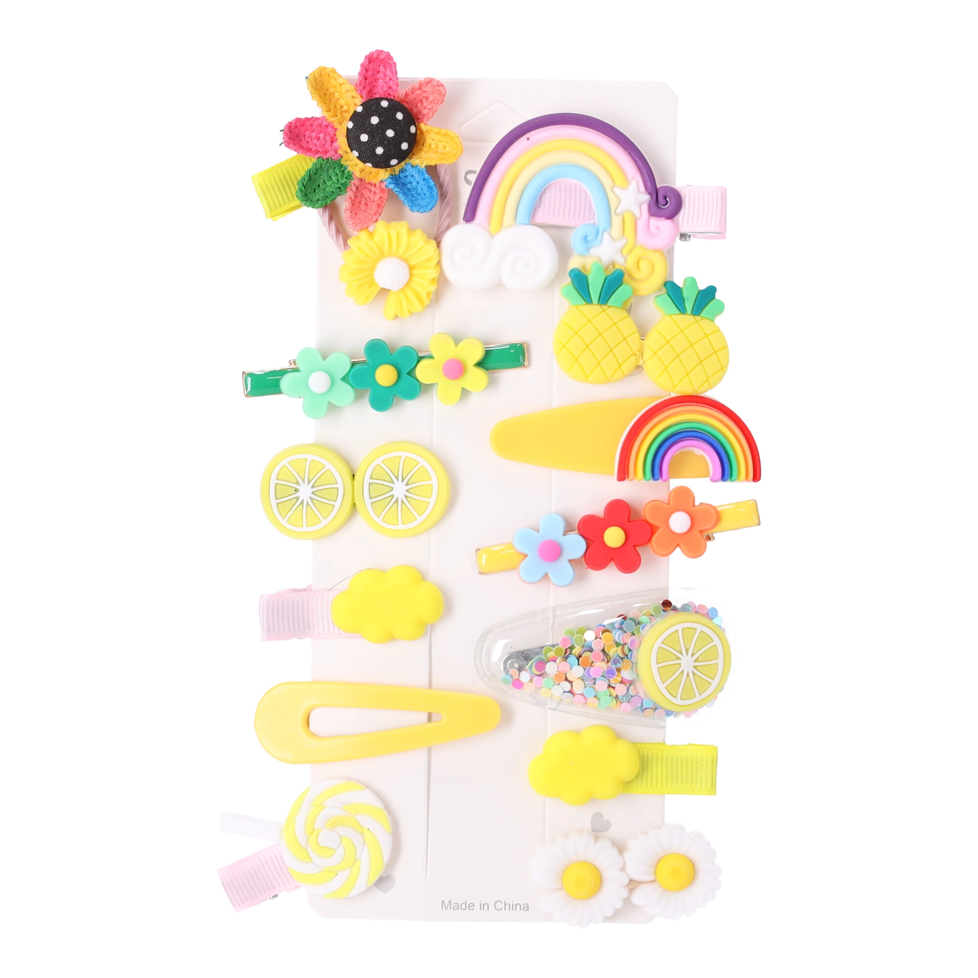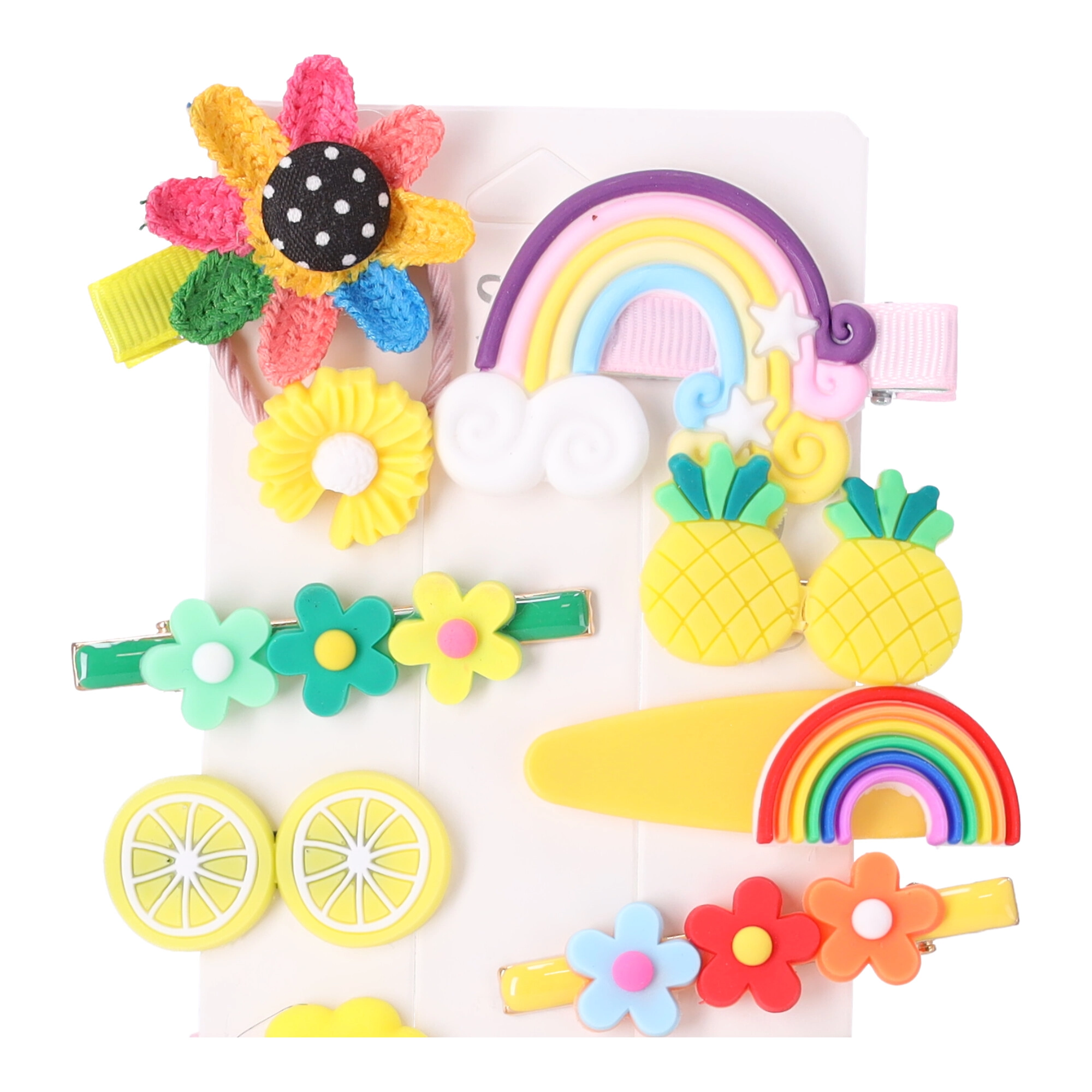 Set 14 kosov ponuja cvetlice, mavrice, sadje in oblačke v pastelnih ter bleščečih odtenkih. Zlahka jih uskladite z oblačili in priložnostjo.