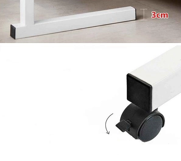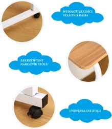 Miza je nameščena na posebej zasnovanem okvirju, ki omogoča udobno uporabo tudi v postelji. Štiri kolesca na osnovi omogočajo hitro in varno premikanje celote. Če želite kolesca na mizi zakleniti, je dovolj, da pritisnete zavoro. Podstavke je mogoče zelo hitro odstraniti. Miza je idealna za uporabo v dnevni sobi, spalnici ali kuhinji. Velika prednost naše mize je nastavljiva višina, zato si jo lahko prilagodite po svojih željah. Miza ima nastavljivo višino 70–90 cm. Dodatna prednost je univerzalen in zelo stilski barvni videz.