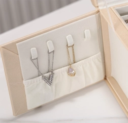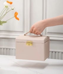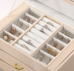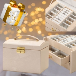 Ta večnivojska škatla za nakit je zasnovana za varno in pregledno shranjevanje uhanov, prstanov, zapestnic, verižic in ur. Mehka notranja podloga ščiti nakit pred odrgninami in vozlanjem, medtem ko zlata kovinska zaponka zagotavlja zanesljivo zapiranje. Brezčasna, modna zasnova se odlično poda v spalnico, garderobo ali otroško sobo.