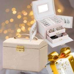 V kompletu je veliko odstranljivo ogledalo za udobno pomerjanje nakita in ličenje. Zahvaljujoč priročnemu ročaju in kompaktnih mer je škatla za nakit enostavno prenosna in primerna tudi za potovanja. Premišljena izdelava in kakovostni materiali zagotavljajo dolgo življenjsko dobo ter vsakodnevno udobje pri uporabi.