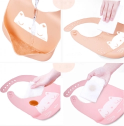Silikonski slinček učinkovito ščiti otroška oblačila pred umazanijo med hranjenjem in hkrati zagotavlja udobje. Ima globok žep, ki ujame ostanke hrane in preprečuje, da bi padli na otrokova oblačila. Po obroku slinček preprosto splaknite v topli milnici. Čudovit slinček je narejen iz mehkega in prijetnega materiala, ki je nežen do otrokove občutljive kože.