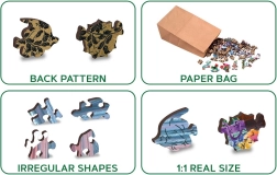 Odkrijte čar lesenih puzzlov WOODEN CITY, ki vas bodo presenetili s svojimi posebej izrezanimi koščki. Ti koščki pogosto predstavljajo živali, zgradbe ali predmete, kar doda še eno dimenzijo zabave in zahtevnosti. Zaradi z laserjem izrezanih detajlov izstopa vsak košček s preciznostjo in gladkimi robovi brez trsk.