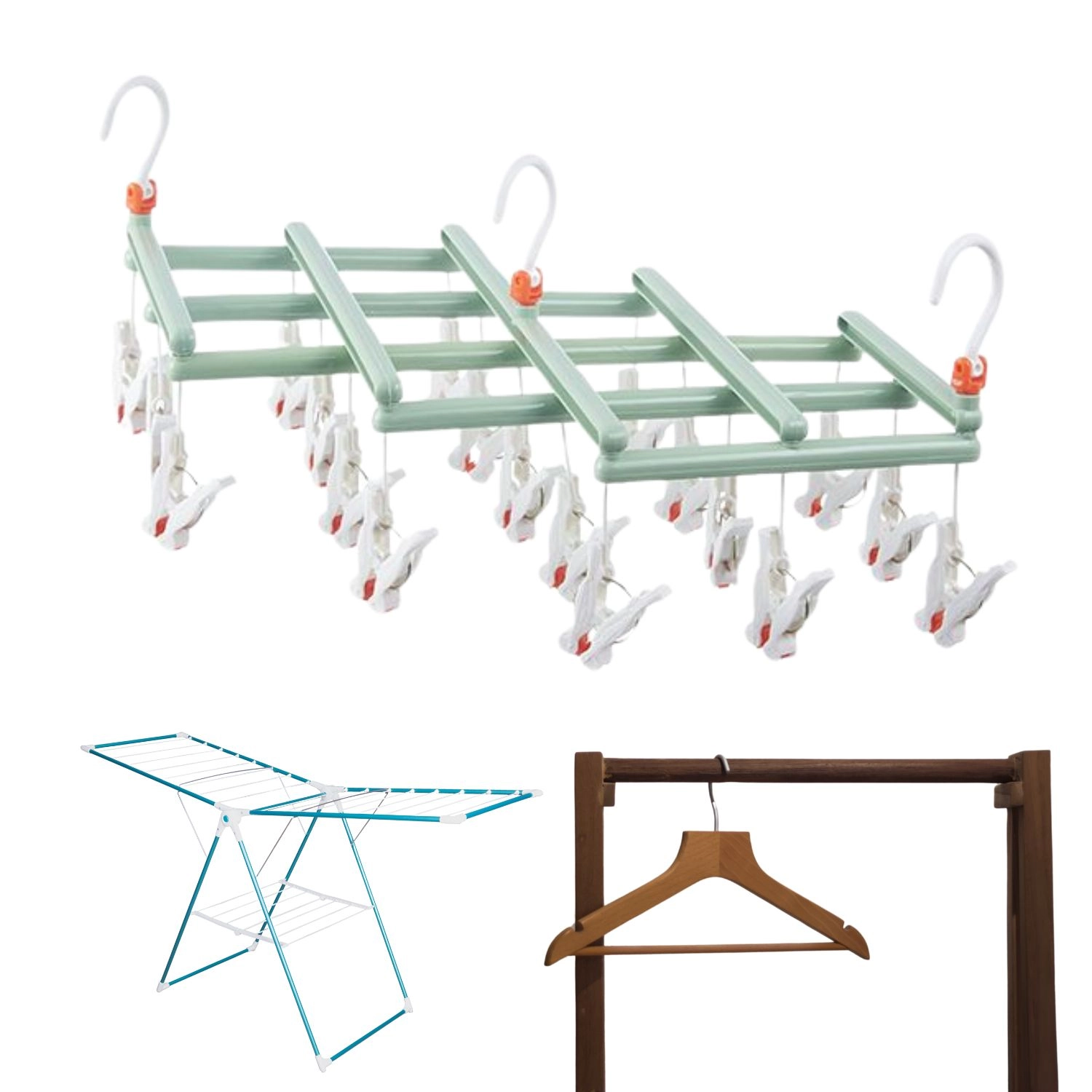 Brez razmetanih nogavic po radiatorju. Ta lahek, a čvrst viseči sušilec z 19 ščipalkami preprosto obesite na omarno palico, balkonsko ograjo ali klasično stojalo za perilo. Zložljiva konstrukcija prihrani prostor in olajša prenašanje ter shranjevanje.