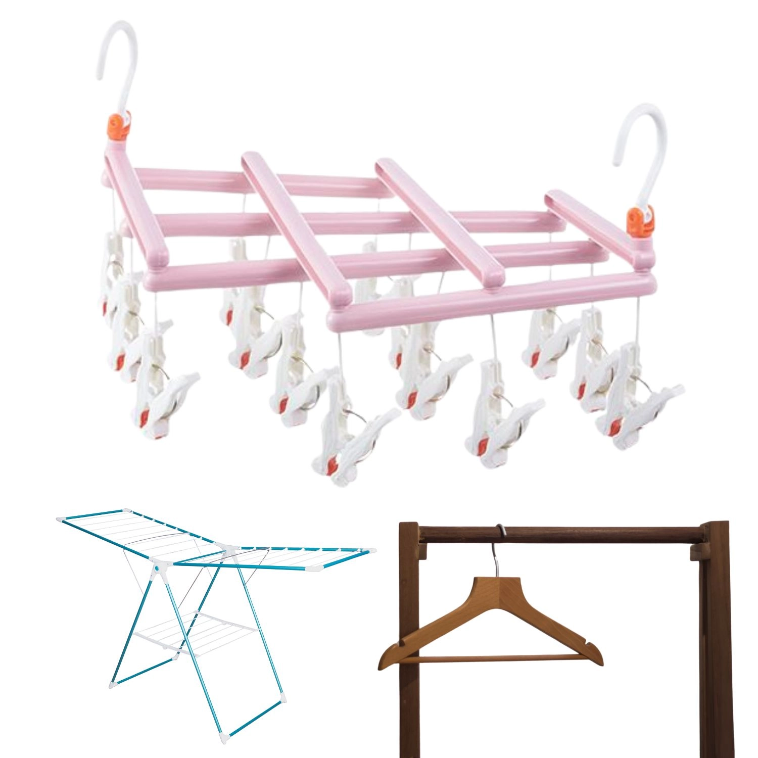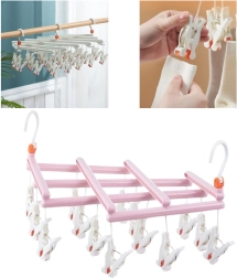 Ohranite red pri sušenju perila in izkoristite vsak centimeter prostora. To rožnato stojalo z 14 trdnimi ščipalkami omogoča hitro in pregledno obešanje manjših kosov perila. Vrtljiv kavelj omogoča enostavno obešanje na drog, vrv, balkon ali klasično stojalo, zložljiv dizajn pa olajša shranjevanje in prenašanje.