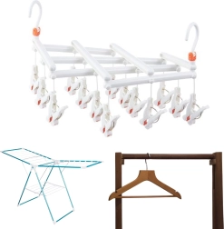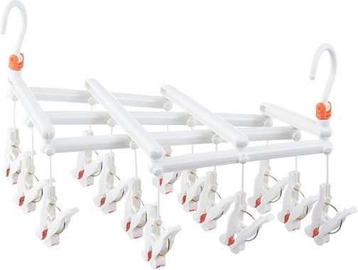 Praktično zložljivo stojalo s 14 ščipalkami je idealno za sušenje nogavic, spodnjega perila in manjših kosov doma in na prostem. Zahvaljujoč vrtljivemu kavlju in kompaktnim meram prihrani prostor in ponuja udobno uporabo. Vzdržljiva plastika, varne ščipalke proti zdrsu in zložljiva zasnova za enostavno shranjevanje naredijo to stojalo odličnega pomočnika za vsako gospodinjstvo.