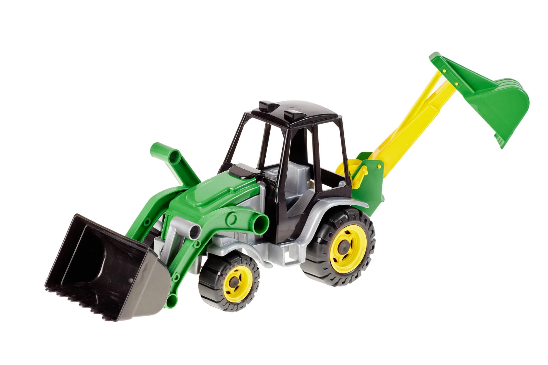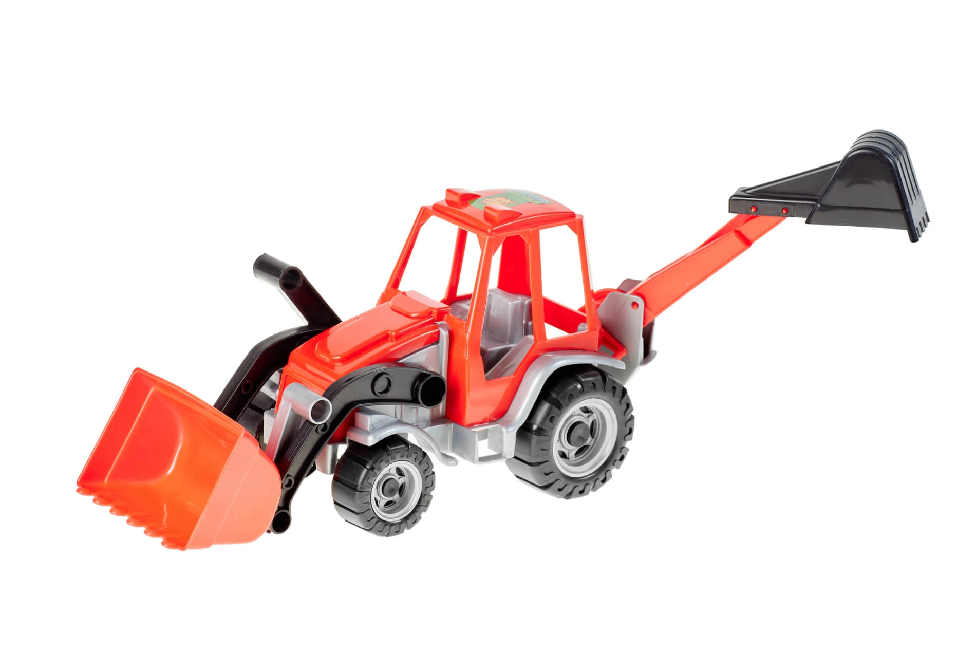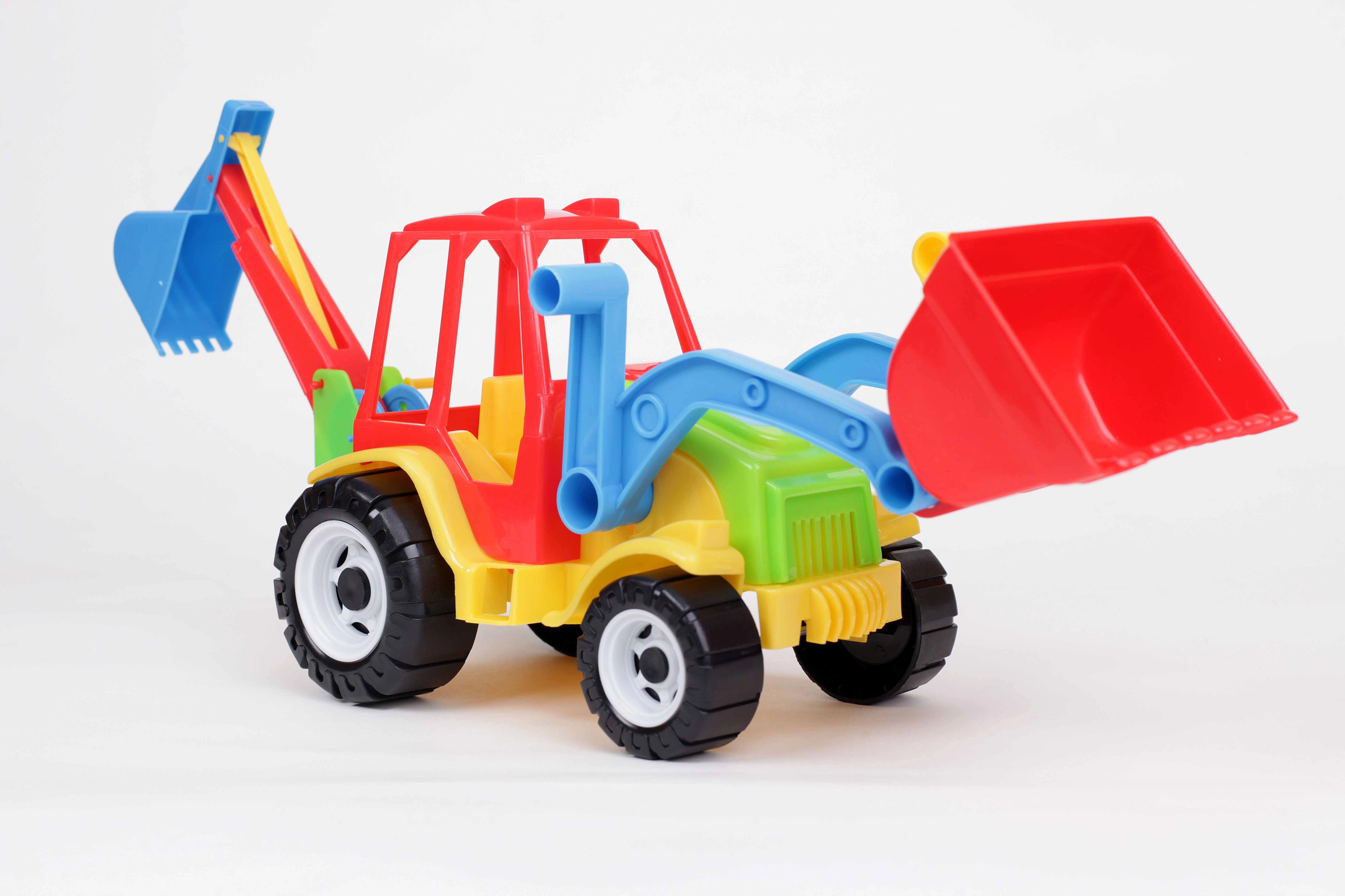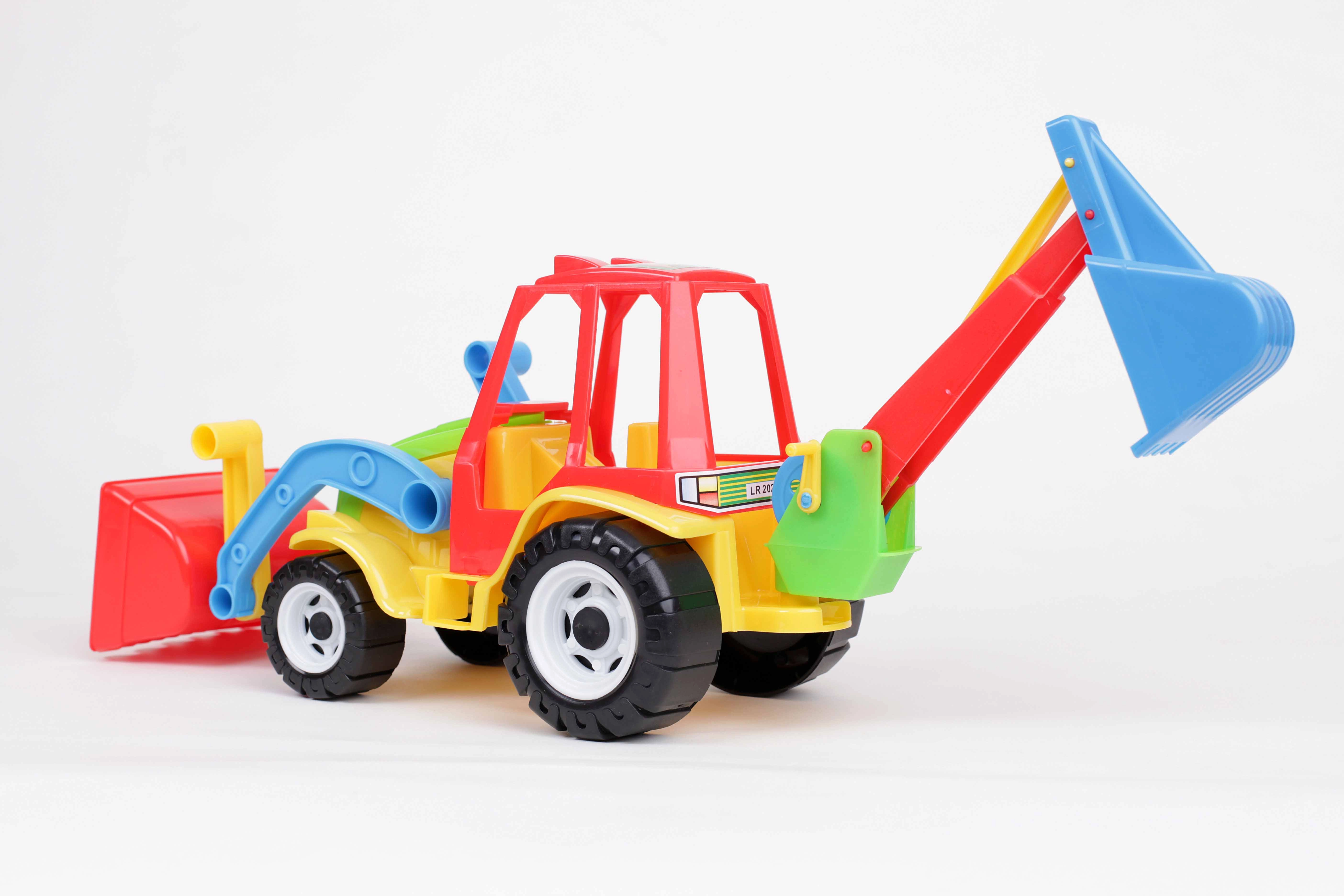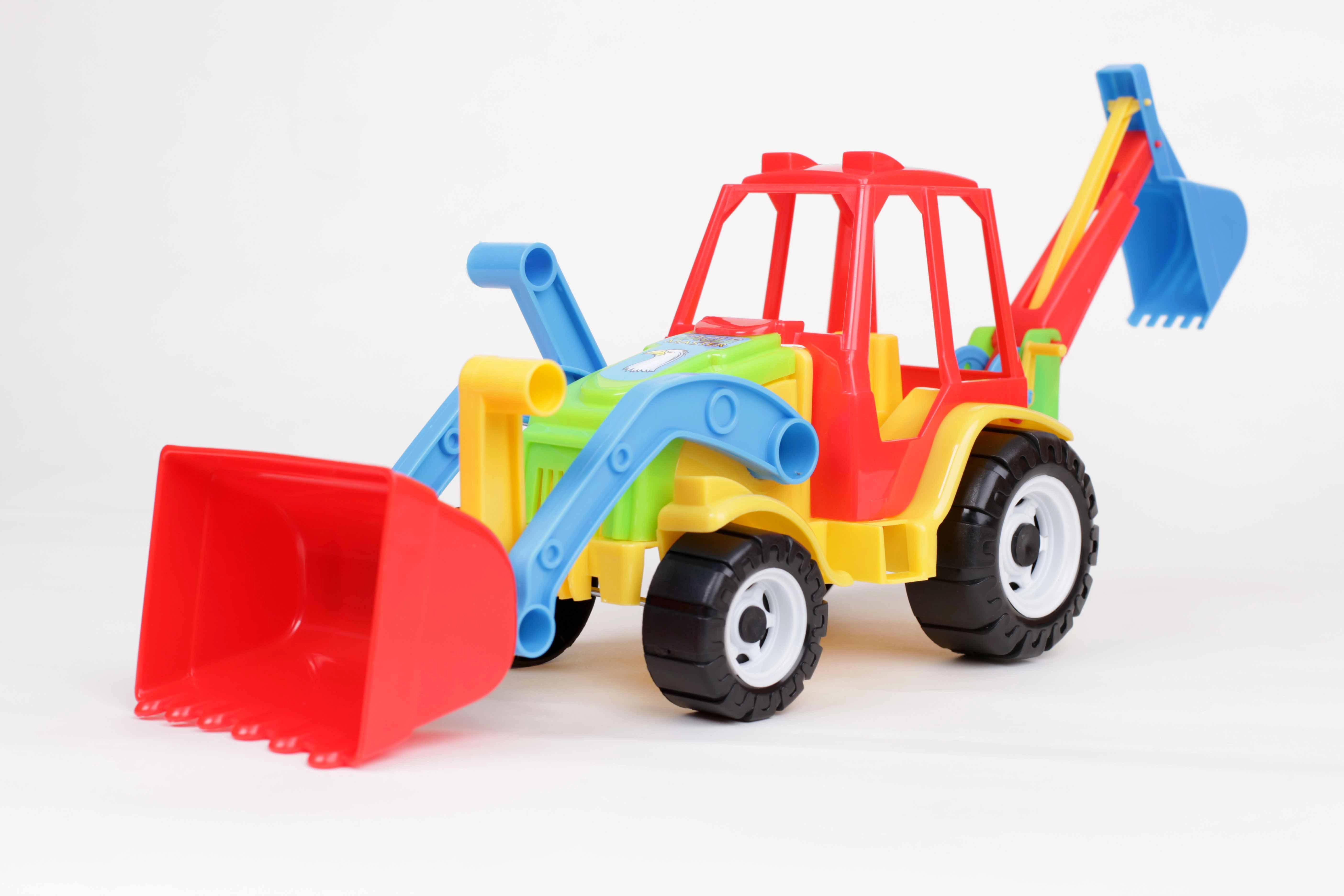 - Plastični traktor s sprednjim nakladalnikom in zadnjim bagrom