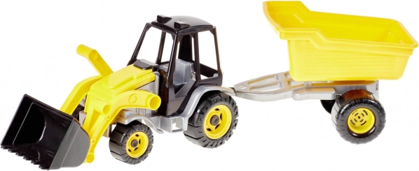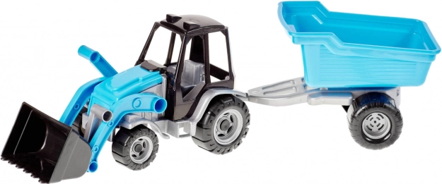 Traktor s širokim gibljivim nakladalnikom v sprednjem delu igrače in z odklopljivo prikolico v zadnjem delu. Modra prikolica, ki jo je mogoče preklopiti nazaj, je nameščena na enosno podvozje. Set ima gibljive elemente, ki bodo popestrili igro vašega otroka in pozitivno vplivali na njegov razvoj.