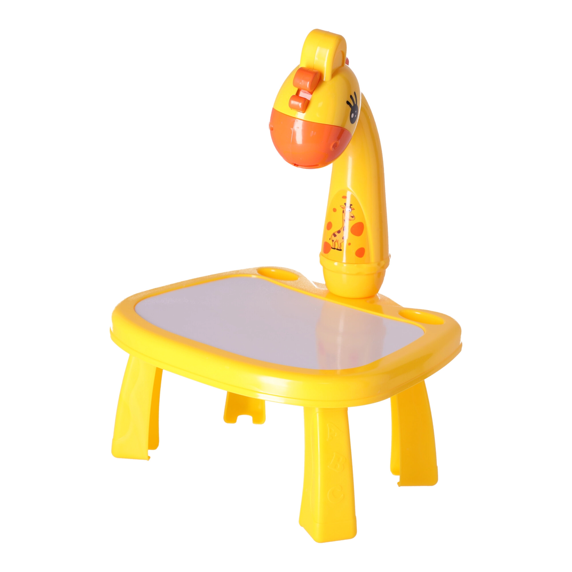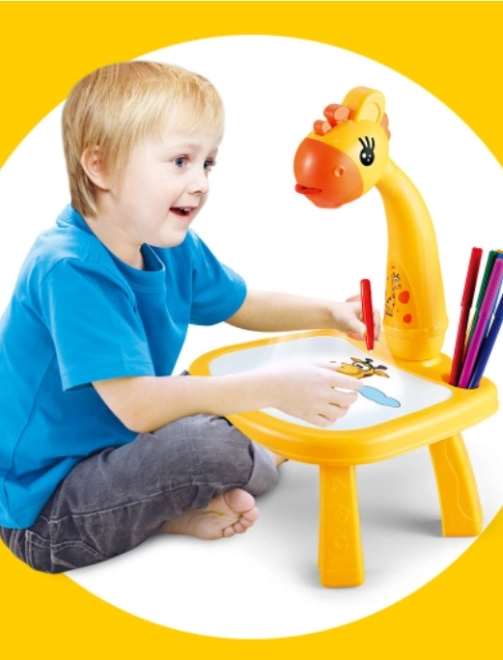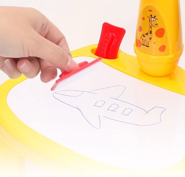 Ta otroški projektor za risanje projicira slike neposredno na risalno površino, zato si otrok izbere motiv, ga preriše in nato pobarva. Učenje poteka skozi igro – otroci vadijo držo pisala, poteze in prepoznavanje barv. Stabilna mizica z žirafjo glavo je lahka in prenosna, zato je odlična tako doma kot na potovanjih.
