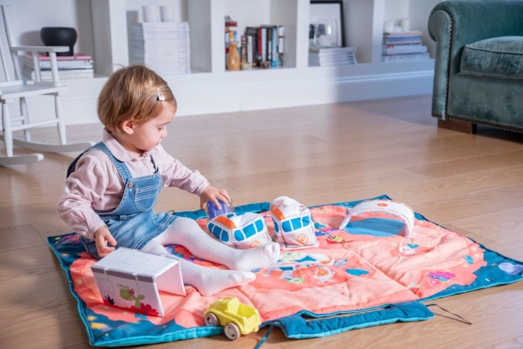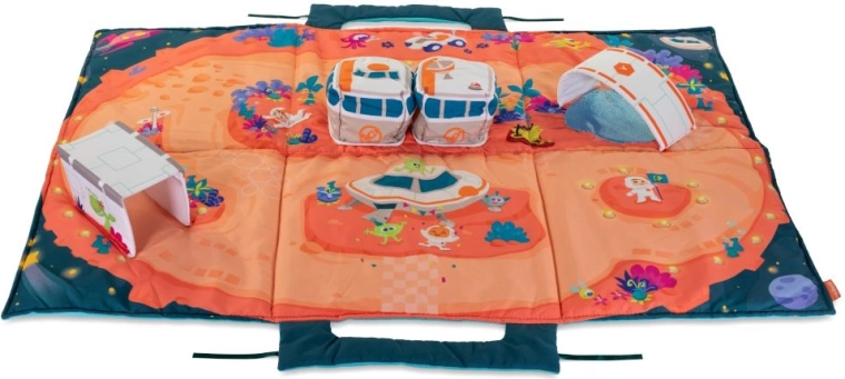 Otroci lahko s to mehko podlogo preživijo ure in ure polne vesoljskih dogodivščin. Podloga pomaga razvijati otrokove čute in domišljijo ter ponuja številne senzorične elemente, kot so šumeči deli, most, tunel, poti in žepki za avtomobilčke.