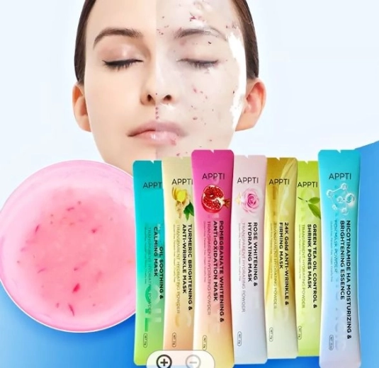 Rožnata maska za obraz v vrečkah, ki zagotavlja predvsem hidracijo. Idealna je za vse tipe kože. Vsebina vrečke po mešanju s pravilno količino vode tvori gel. Ta količina je povsem zadostna za prekrivanje celotnega obraza.