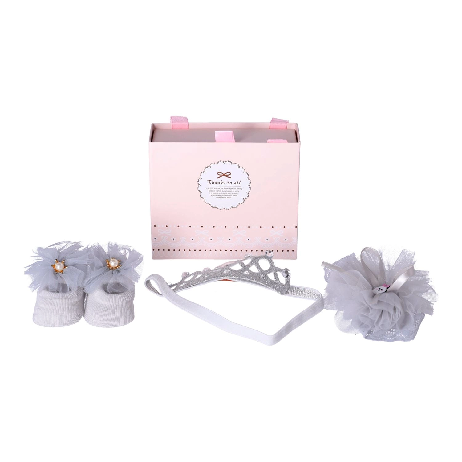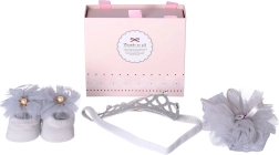 Očarljiv darilni komplet 3 v 1 za novorojenčka vsebuje dva udobna naglavna traka in ujemajoče se copatke/nogavičke, vse v nežni svetlo sivi barvi. Odlično za krst, dobrodošlico dojenčku ali baby shower. Zahvaljujoč mehkem in raztegljivem materialu naglavni trakovi ne tiščijo glavice, stilni okrasni elementi pa vsakemu outfitu dodajo poseben pridih. Set je priložen v dekorativni darilni škatli, pripravljen za takojšnje podarjanje.