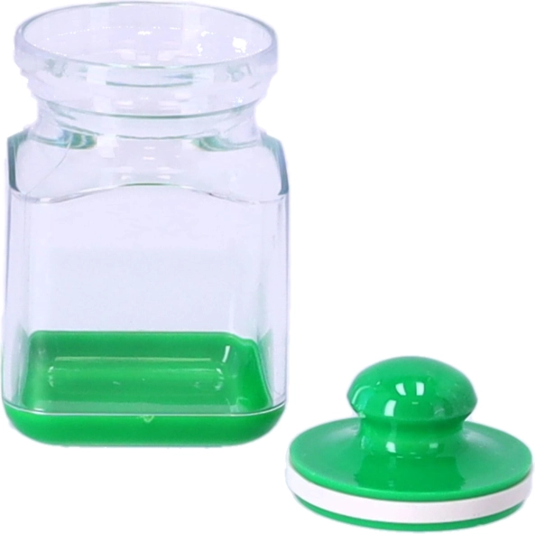 Plastična posoda za začimbe ima pokrov s kroglastim ročajem, ki ga je mogoče udobno dvigniti, kar zagotavlja njeno neprepustnost.
