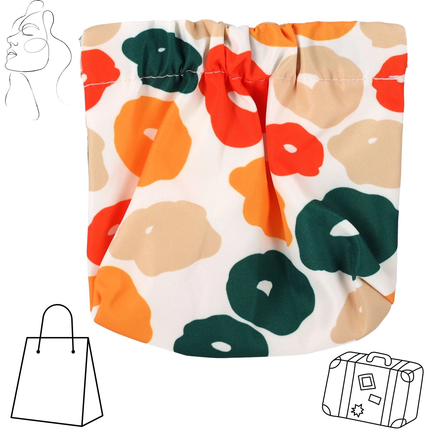 Elegantna barvna izvedba s cvetličnim motivom se odlično ujema z različnimi stili in doda vašemu vsakdanu pridih šarma. Kompaktna velikost omogoča udobno shranjevanje v torbici, nahrbtniku ali ročni prtljagi, elastično zatezanje pa varno drži vsebino na mestu.