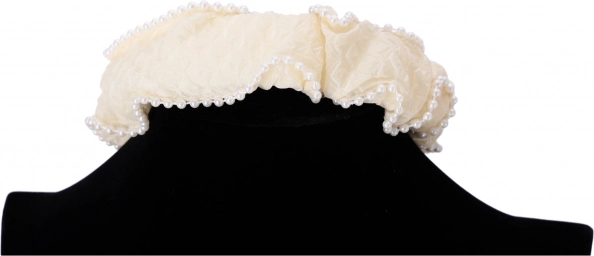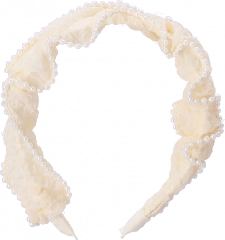 Ta bel naglavni trak z drobnimi perlami je stilski dodatek, ki povzdigne tudi preprost outfit. Tekstilna površina z gubastim učinkom in diskretni perlni rob delujeta elegantno, a še vedno nežno. Odlično se ujema z razpuščenimi lasmi, čopom ali figo.