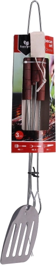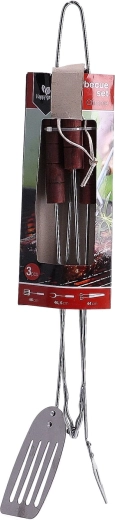 Tridelni komplet žarnega pribora vsebuje klešče, lopatko in vilice iz kromiranega jekla. Ročaj je izdelan iz lesa. Komplet vsebuje osnovno orodje, potrebno za žarjenje. Orodje je opremljeno z obešalnim ušesom.