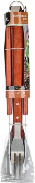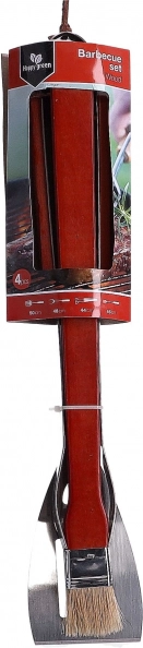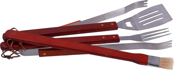 4-delni komplet pripomočkov za žar vsebuje krtačo, klešče, lopatico in vilice iz nerjavečega jekla. Komplet vsebuje osnovna orodja, potrebna za peko na žaru. Orodje je opremljeno z zanko za obešanje.