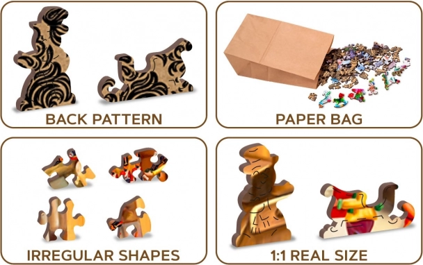 Sestavljanje sestavljanke z različno oblikovanimi koščki je zahtevnejše in predstavlja večji izziv kot klasične sestavljanke. Sestavljanka je poleg tega obojestranska – sestavljate lahko po sliki (licna stran) ali po obliki (hrbtna stran z vzorcem). Znamka WOODEN CITY poleg edinstvenega koncepta sestavljank ne pozablja na ekologijo, zato pri teh izdelkih ne boste našli nobene plastične embalaže. Z edinstveno oblikovanimi koščki, ki predstavljajo znane stavbe, predmete ali živali glede na temo motiva. Višja zahtevnost kljub manjšemu številu koščkov – sestavljanje z raznoliko oblikovanimi koščki je zahtevnejše.