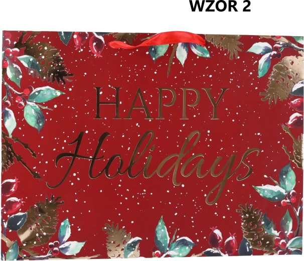 Vzorci in dizajn: Vrečka je okrašena z različnimi prazničnimi vzorci in motivi. Ti lahko vključujejo slike, kot so snežinke, okraski za božično drevo, severni jeleni, Božiček ali drugi z božičem povezani motivi. Napis "Happy Holidays" doda topel in vesel pridih.