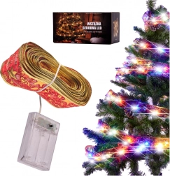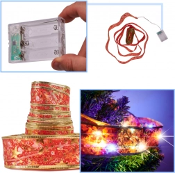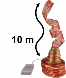 Ta božični trak združuje dekorativni videz s svetlobnim učinkom. Zlato-rdeč pas z vgrajenimi LED diodami po celotni dolžini ustvarja nežno, barvito svetlobo in je odlična izbira za božično drevo, ograjo, kaminsko polico ali praznične aranžmaje. Baterijsko napajanje omogoča uporabo tudi brez dostopa do vtičnice.