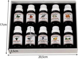 Celoten set vsebuje 10 različnih dišav, kot so evkaliptus, pomaranča, meta, sivka in druge. Vsaka steklenička ima prostornino 15 ml.