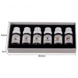 Komplet vsebuje šest različnih vonjev, kot so evkaliptus, pomaranča, tea tree, meta, sivka in bor. Vsako olje je skrbno zaprto v steklenički s prostornino 10 ml.