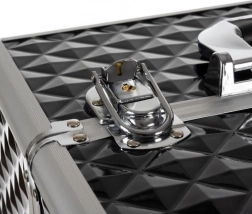 Kombinacija črnega in srebrnega kovinskega odtenka z geometrijskimi vzorci daje kovčku moderen videz, hkrati pa zagotavlja njegovo trpežnost.